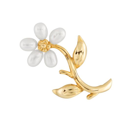 This 10k yellow gold broach features a beautiful spring flower created with rice shaped 4-5mm white pearls.