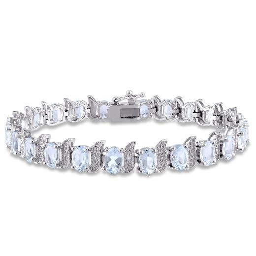 This lovely tennis bracelet features oval-cut aquamarine stones enhanced with round white diamonds set in sterling silver. This gorgeous piece is secured with a box-with-tongue clasp.