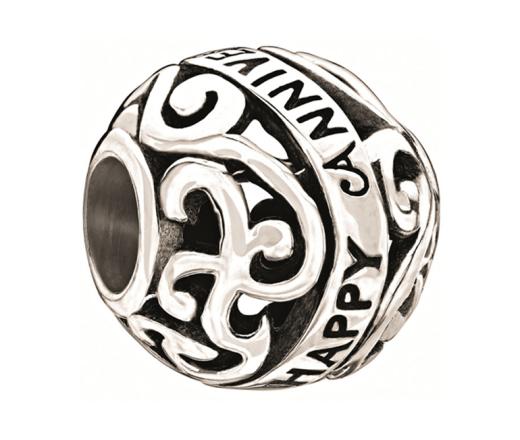 An extremely delicate curling sliver pattern and band with the message Happy Anniversary makes this round bead the perfect complement to celebrate a special day.