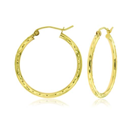 The diamond-cut texture adds a playful sparkle to the classic hoop shape, enhancing their overall appeal.
