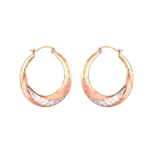 These earrings showcase a classic hoop design enriched with intricate diamond-cut detailing. The harmonious blend of yellow, white, and rose gold adds a touch of versatility, making them a statement accessory for any occasion. The diamond-cut texture enhances their brilliance, creating a play of light that captures attention. Embrace the timeless allure of these finely crafted tri-colour gold hoop earrings, a symbol of enduring sophistication and contemporary style.