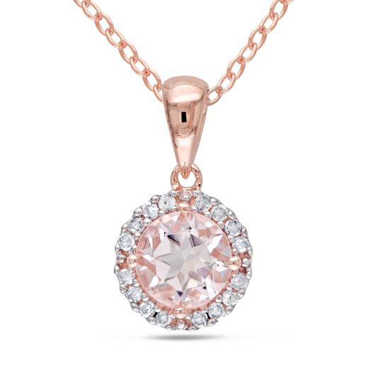 This marvelous necklace features a round-cut morganite framed by a halo of round diamonds set in rose plated silver. This gorgeous pendant is hung on a cable chain and is secured with a spring ring clasp.
