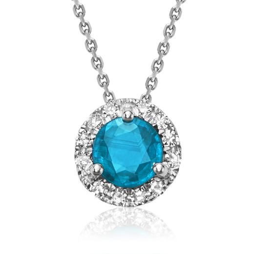 This stunning pendant is made with 10k white gold, a round cut blue topaz and round cut sparkling diamonds. Choose this gorgeous piece either for yourself or as a special gift for someone you love. Special order this item today!