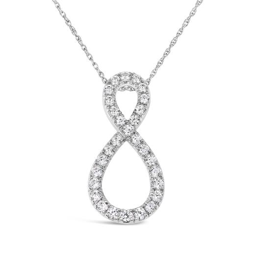 Captivate the room in this breathtaking diamond infinity pendant. With over 25 perfectly round cut diamonds, this necklace boasts 1.00CTW of sparkle. Set in impressive 10K white gold, with an 18in chain, this necklace is suitable for day or nighttime wear.