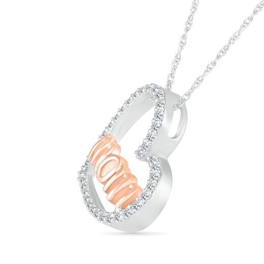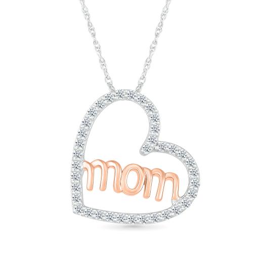 This pendant is a heartfelt tribute, featuring a heart-shaped design crafted in sterling silver, adorned with the word "Mom" in lustrous 10K rose gold. The 0.29 carats of diamonds add a touch of brilliance, creating a piece that symbolizes the enduring and unconditional love of a mother. Suspended from a delicate sterling silver chain, this pendant is a meaningful and versatile accessory for various occasions. Whether you're expressing your love or gifting it to a special mom in your life, let the Sterling Silver & 10K Rose Gold Diamond Mom Heart Pendant be a radiant reminder of the warmth and beauty of maternal love.