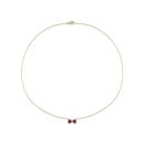 Add a splash of colour to your ensemble with this vibrant bow necklace. This chic necklace is crafted in lustrous yellow gold and features two prong and channel set heart-cut, garnet gemstones with three round, buttercup set diamonds (G-H-I, I2-I3) to form a bow. The pendant is suspended on a 17-inch round cable chain secured with a lobster clasp. Polished to a brilliant shine, this necklace is the epitome of femininity.