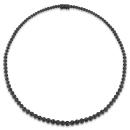 Adorn your neckline with this classic Black Diamond Tennis Necklace. Crafted in lustrous black rhodium plated sterling silver, it features 65 round-cut, shared prong-set, glittering diamonds (HIJ, I3) lined beautifully forming a tennis pattern. This gift worthy necklace measures 17-inches in length and secures with a lobster clasp. Polished to a brilliant shine, wear this layerable necklace to add a touch of sophistication and elegance to your look.