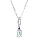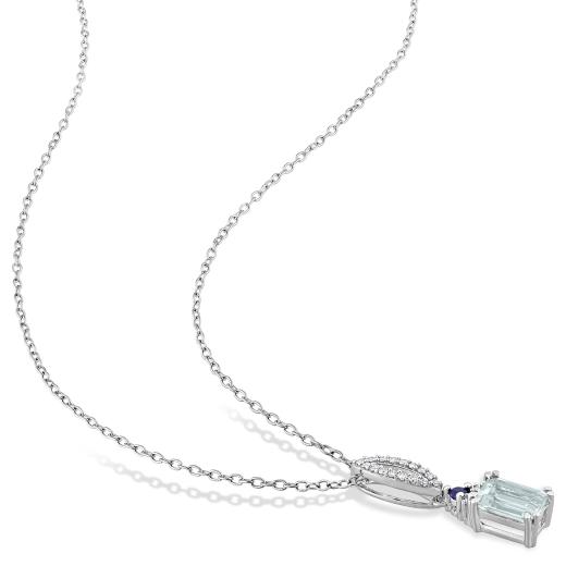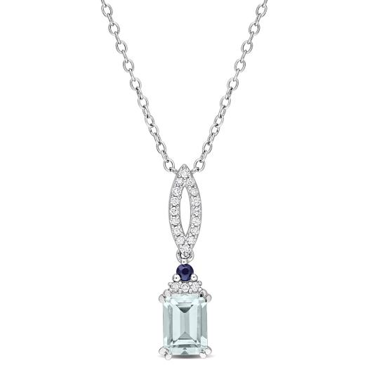 This pendant is a captivating masterpiece that combines the serene hues of aquamarine with the rich blue tones of sapphires, all set in lustrous sterling silver. The intricate design is adorned with sparkling diamonds, adding a touch of brilliance and opulence to the piece. Suspended from a delicate sterling silver chain, this pendant is a versatile and eye-catching accessory for various occasions.