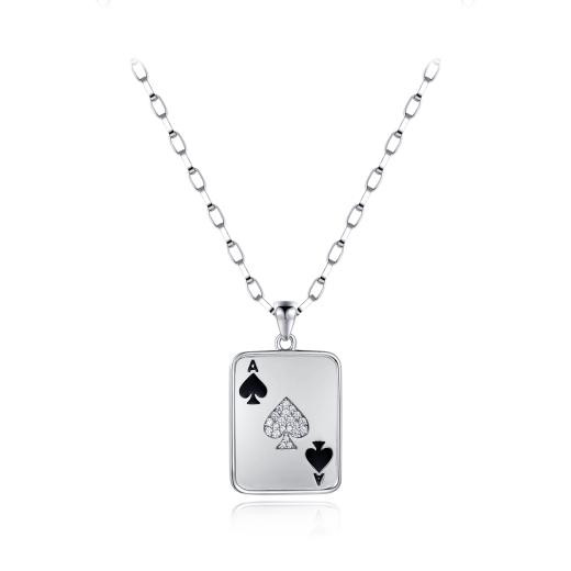 This striking 24" pendant features the iconic Ace of Spades design, crafted in sterling silver and embellished with sparkling cubic zirconia. The combination of intricate detail and brilliant stones creates a bold and stylish statement, making it a perfect accessory for adding a touch of edge and elegance to any look.
