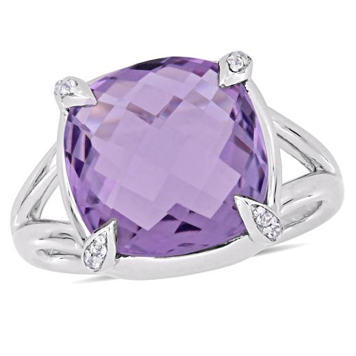 This bold amethyst and white topaz accent cocktail ring is crafted in lustrous sterling silver and features a cushion double checkerboard-cut amethyst stone as its centerpiece with a total of eight round-cut white topaz stones studding the prongs of its unique split shank design. Instantly add a touch of color and elegance to any ensemble with this stunning gemstone ring.