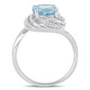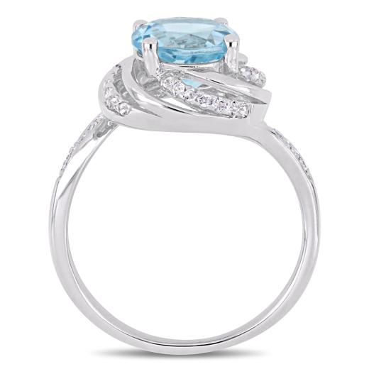 This unique sky-blue topaz, white topaz and diamond halo ring is crafted in lustrous sterling silver and features a round-cut, prong-set sky-blue topaz at the center with 28 round-cut, buttercup-set white topaz and eight round-cut, prong-set diamond accents set together in a modern swirl halo design. This ring is perfect for a woman who seeks simplicity and elegance in her everyday look. This piece is sure to make a valuable and valuable addition to any jewelry collection. A lovely piece for that special November birthday in your life.