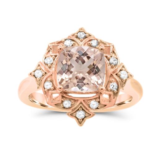This modern and sophisticated ring is crafted in lustrous 10-karat rose gold and features a cushion-cut morganite stone at the centre, accented with white sapphires. This ring is sure to be the perfect gift either for yourself or your loved one.