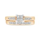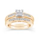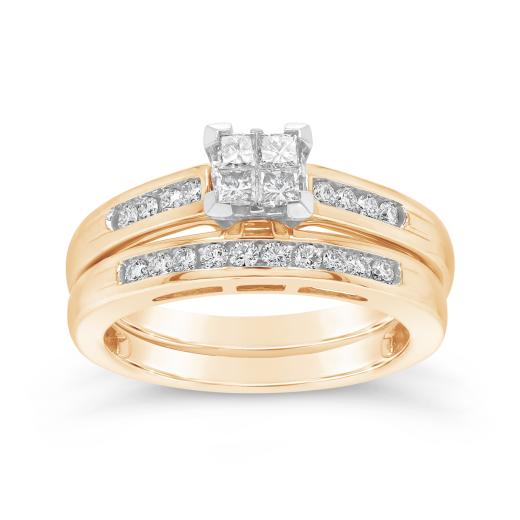 This bridal set offers a beautiful and sophisticated choice for an engagement and wedding ring. Its combination of yellow gold and sparkling diamonds creates a captivating and elegant ensemble.