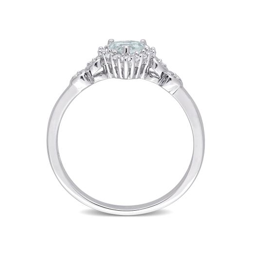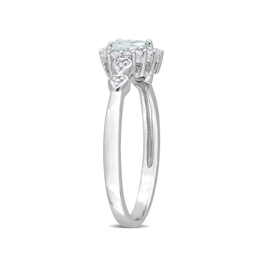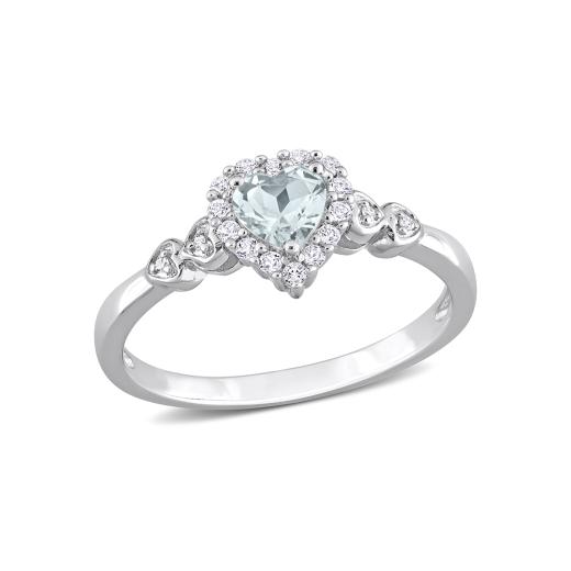 Accessorize flawlessly with this delicate halo promise ring. Crafted in luminous sterling silver, this classic ring features a heart-cut, prong-set aquamarine decorated with a halo created by 14 prong-set white topaz gemstones and four pave-set diamonds (G-H-I, I2-I3) embellished halfway on both sides of the band in heart designs. Finished with a brilliant shine, this beautiful ring is perfect for daily wear.