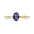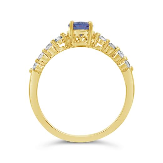 This tanzanite and diamond ring is set in 10-karat yellow gold and features an oval-cut tanzanite and diamond studded design. This ring is a perfect choice for today's contemporary woman.