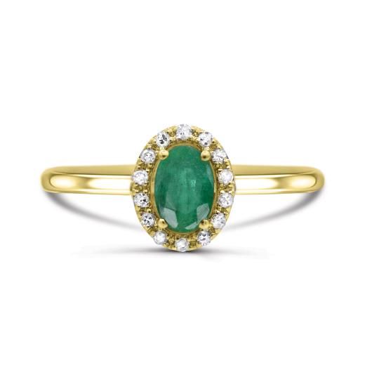This 10K yellow gold ring features a stunning emerald at its center, surrounded by a halo of dazzling diamonds. The rich green of the emerald contrasts beautifully with the sparkling diamonds, creating a piece that is both elegant and eye-catching. The warm yellow gold setting enhances the brilliance of the gemstones, making this ring a timeless addition to any collection.