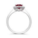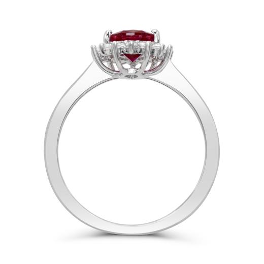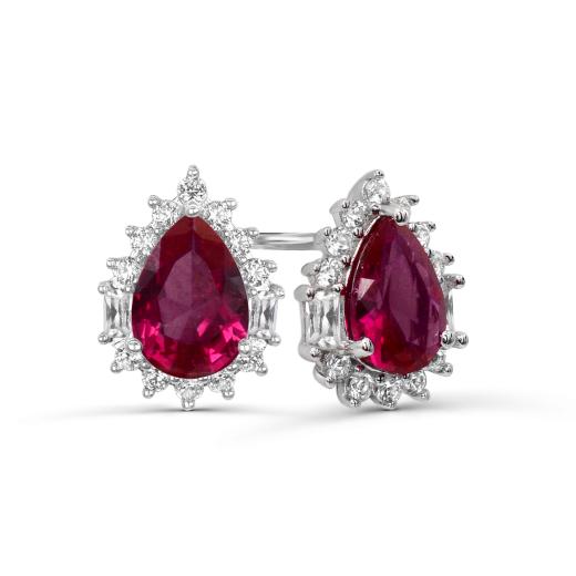 This sterling silver ring showcases a stunning created ruby at its heart, flanked by shimmering created white sapphires that enhance its fiery brilliance. The rich red hue symbolizes passion and confidence, while the white sapphires add a refined touch of sparkle.