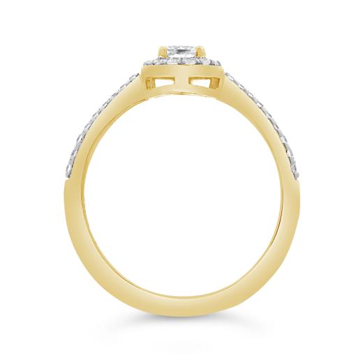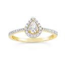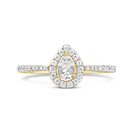 Elegant and timeless, this New Brilliance ring features a sparkling pear‑shaped lab grown diamond at the center, framed by a shimmering halo of round diamonds. Additional diamonds are set along the slender band, adding brilliance and creating a seamless, flowing look. Crafted in warm 10K yellow gold, the design offers a beautiful contrast that enhances the stone’s fire and shape. Altogether, the diamonds total 0.37 CTW, delivering radiant sparkle from every angle.