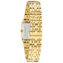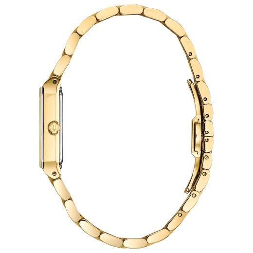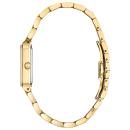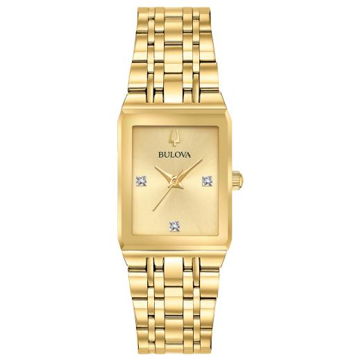 Introducing a new tank style. Gold tone stainless steel case with edge to edge faceted metalizing mineral crystal and gold tone crown. Champagne dial with three diamonds set on dial.